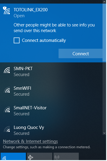B7: Sau khi thiết lập xong, kết nối lại với wifi vừa thiết lập (wifi totolink của thiết bị đã biến mất và chuyển thành wifi mới thiết lập)
