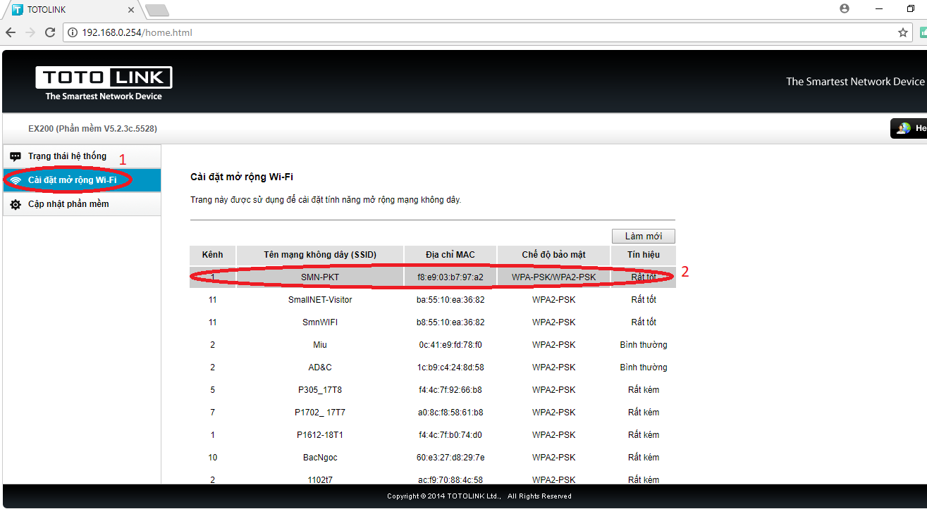B4: Chọn Cài đặt mở rộng wifi (1) -> chọn wifi muốn mở rộng sóng (2)