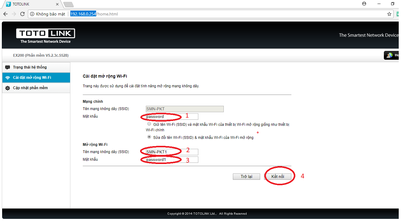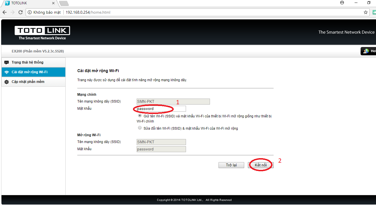 B5: Nhập mật khẩu hiện tại của wifi muốn mở rộng sóng (1) -> giữ tên wifi (SSID) và mật khẩu … -> kết nối (2)